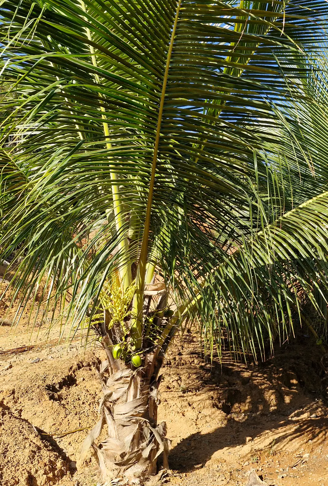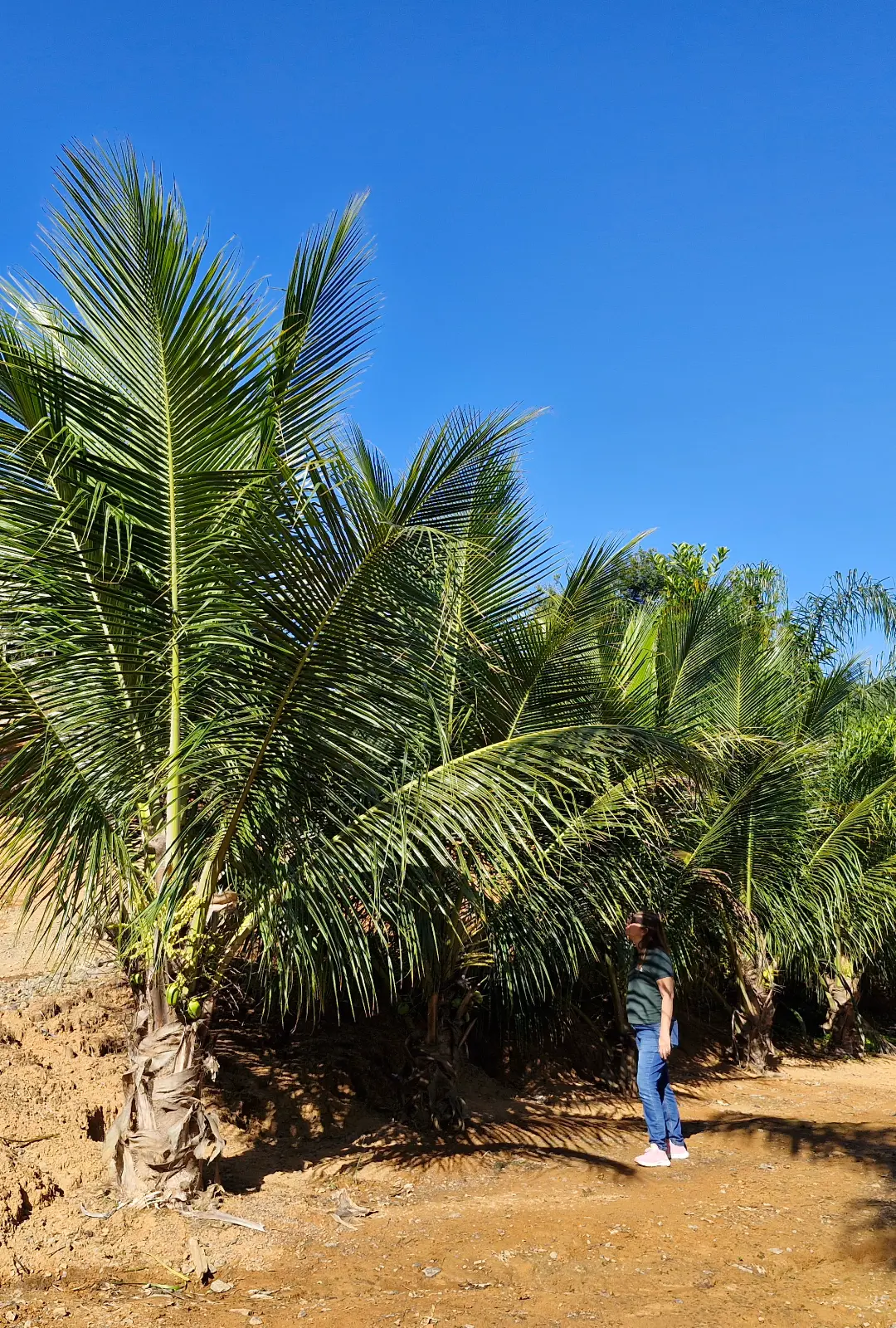 Quando adulto, o coqueiro-anão atinge cerca de 4 a 6 metros de altura, facilitando a colheita manual dos cocos em comparação ao coqueiro gigante.